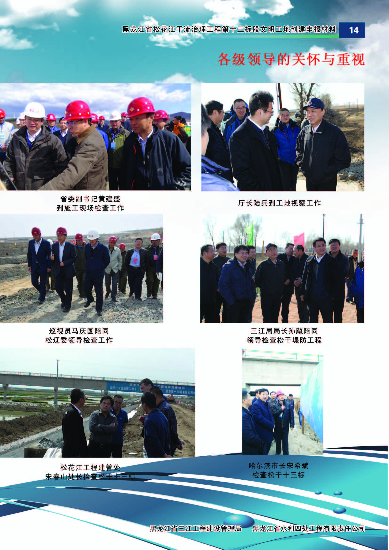 黑龍江省委、省政府高度重視三江干流治理工程建設(shè),成立了以省委主要領(lǐng)導(dǎo)為組長(zhǎng)的三江治理工程建設(shè)領(lǐng)導(dǎo)小組,多次召開專題會(huì)議部署建設(shè)工作。按照省委、省政府的統(tǒng)一部署,黑龍江省水利廳組建了黑龍江省三江工程建設(shè)管理局為項(xiàng)目法人單位,委派松花江工程建設(shè)管理處具體負(fù)責(zé)松花江干流治理工程的建設(shè)與管理。